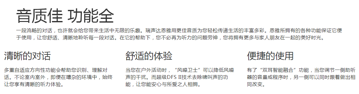 瑞聲達恩雅以持久耐用、考慮周全的設計向您傳遞美妙的音質,助您更好地與他人進行對話。作為一款無線助聽器,恩雅具有2.4GHz無線傳輸技術,可以讓您直接將自己鐘愛的聲音傳輸至助聽器。配合瑞聲達“隨手調”手機應用,控制調節(jié)將變得更方便。