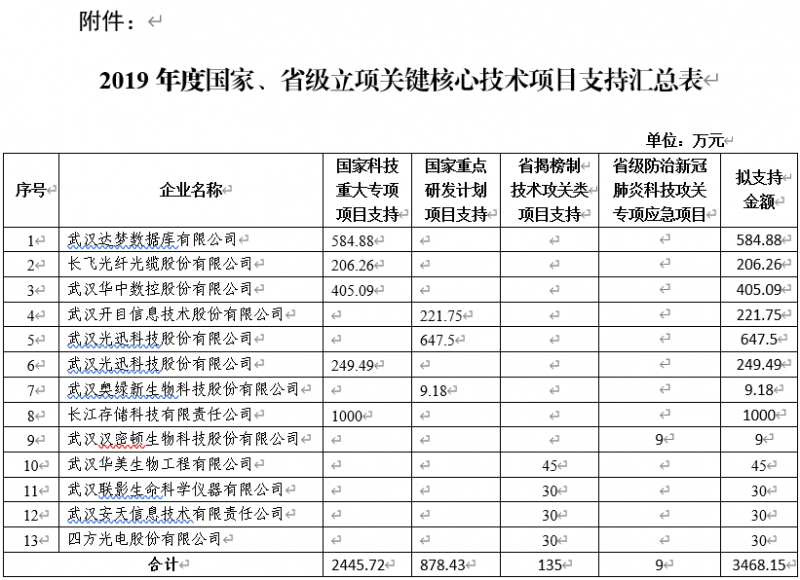 按照《關(guān)于申報東湖高新區(qū)2019年度國家、省級立項(xiàng)關(guān)鍵核心技術(shù)項(xiàng)目支持的通知》要求以及管委會相關(guān)規(guī)定,經(jīng)企業(yè)申報、審核、實(shí)地考察等流程,現(xiàn)將支持結(jié)果予以公示,公示期為2020年6月9日-6月15日。如有異議,請于6月15日下午17:00前將書面意見(蓋公司/單位公章)反饋至管委會科創(chuàng)局,逾期不予受理。