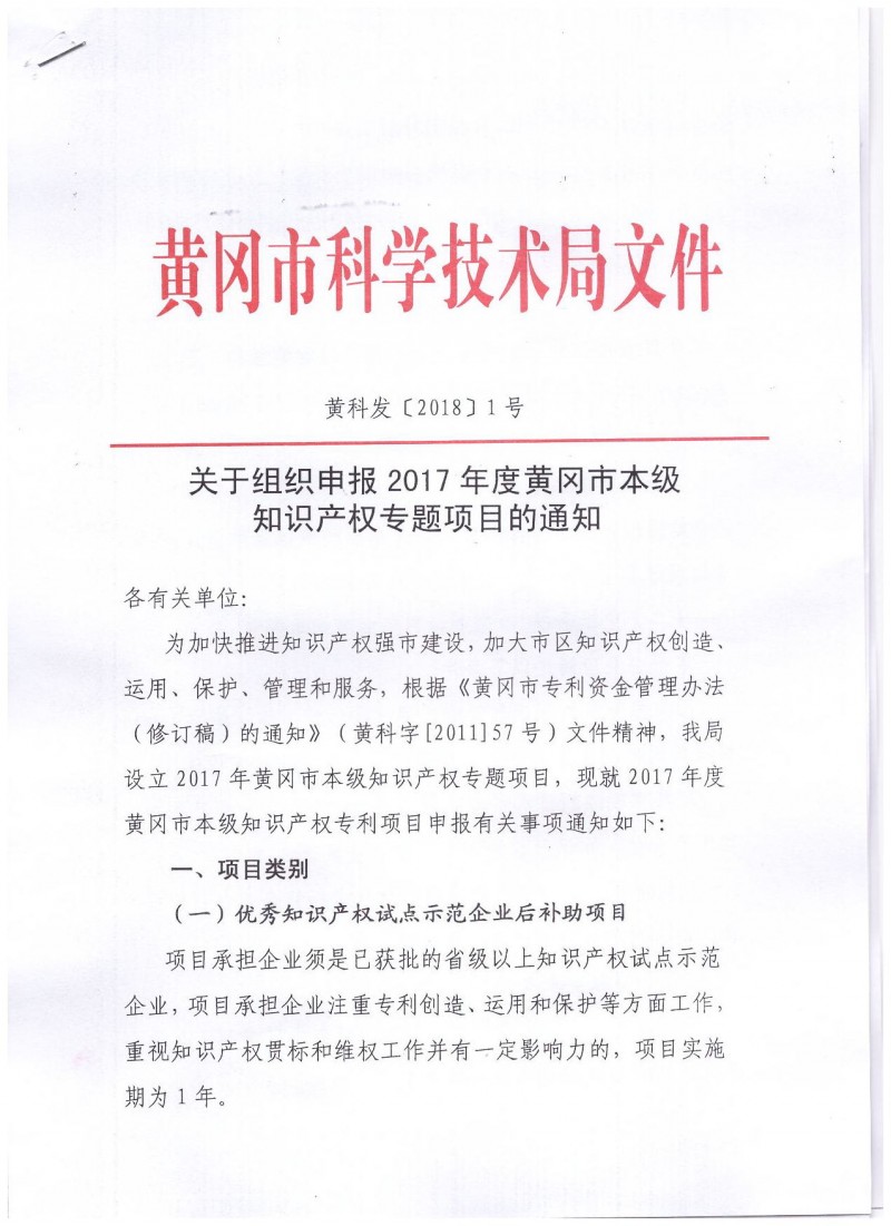 關(guān)于組織申報2017年度黃岡市本級知識產(chǎn)權(quán)專題項目的通知