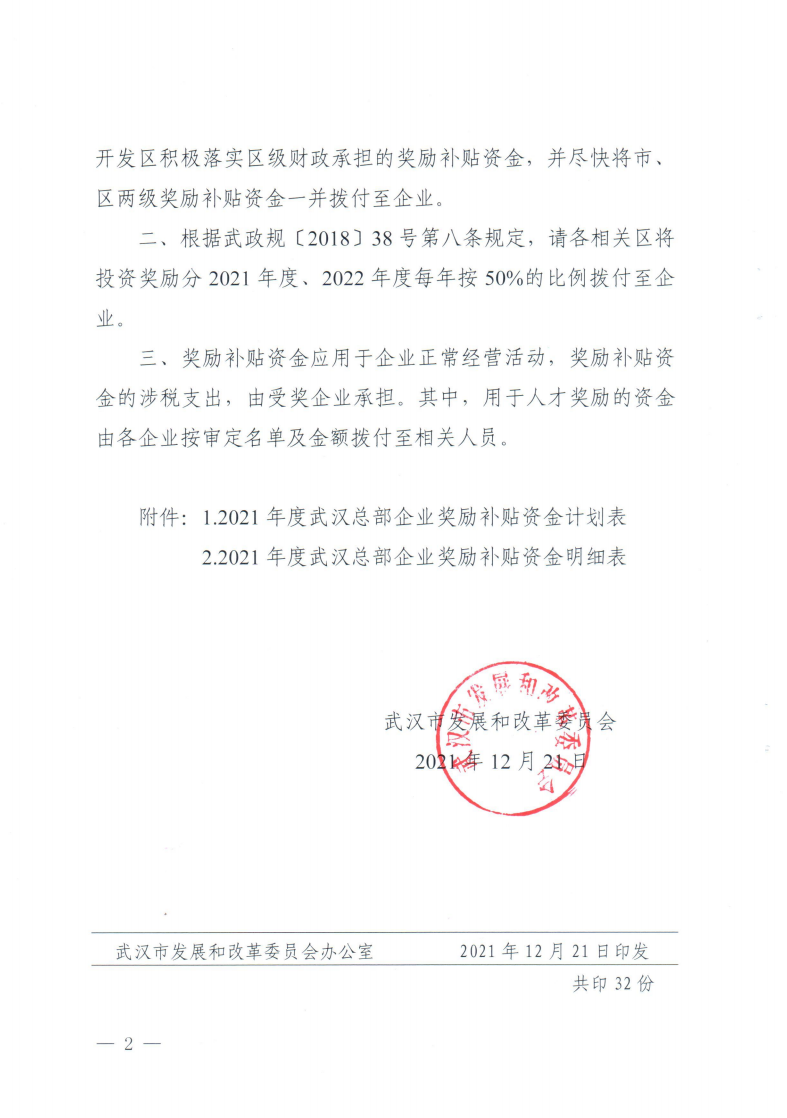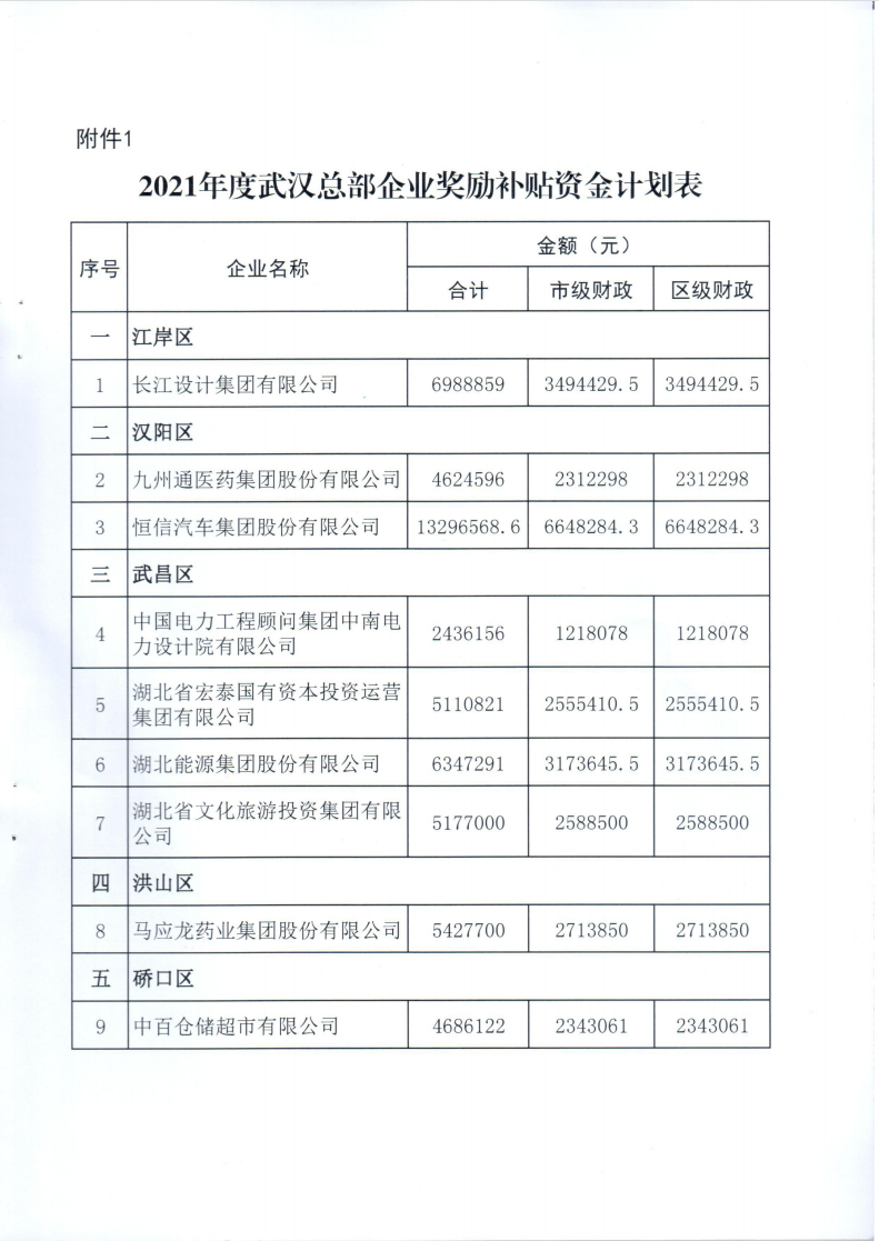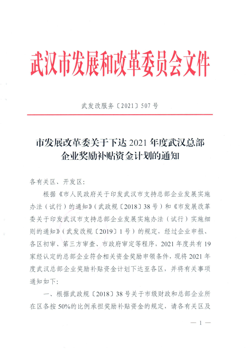 市發(fā)展改革委關(guān)于下達(dá)2021年度武漢總部企業(yè)獎(jiǎng)勵(lì)補(bǔ)貼資金計(jì)劃的通知